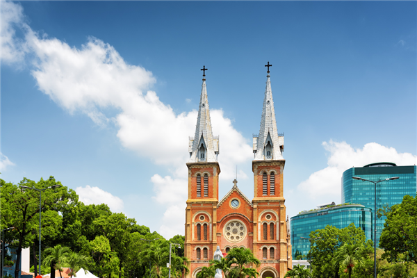 Vi fortsätter utforska staden och stannar till vid två vackra franska koloniala landmärken i hjärtat av staden. Notre Dame-katedralen och det centrala postkontoret, designat av Gustave Eiffel, och som är en av de mest eleganta byggnaderna i Saigon.